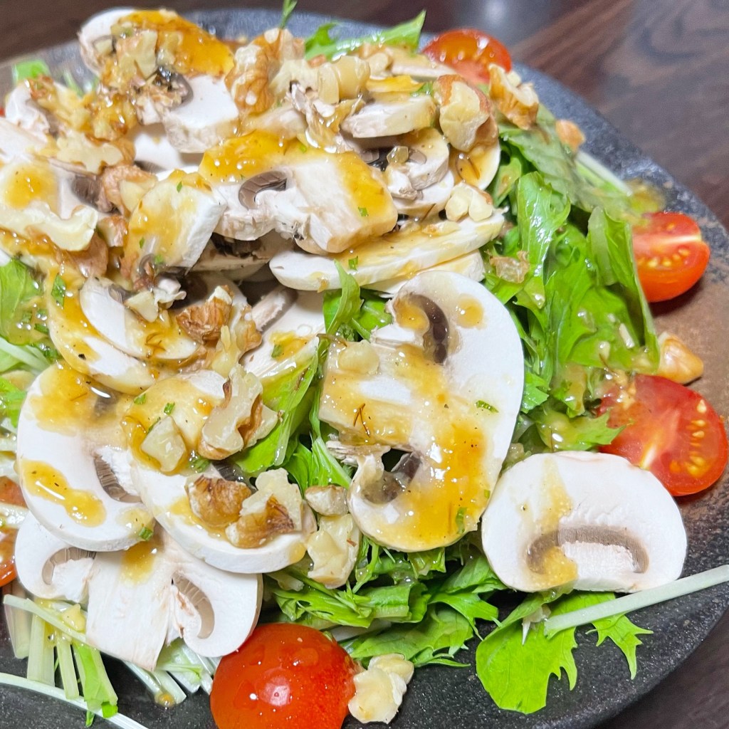 生マッシュルームのサラダは大好きなのでよく食べてます。が、大抵はクリーミー系やごまベースのドレッシングにしていました。