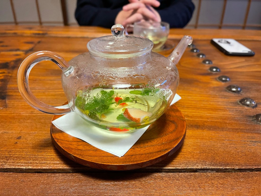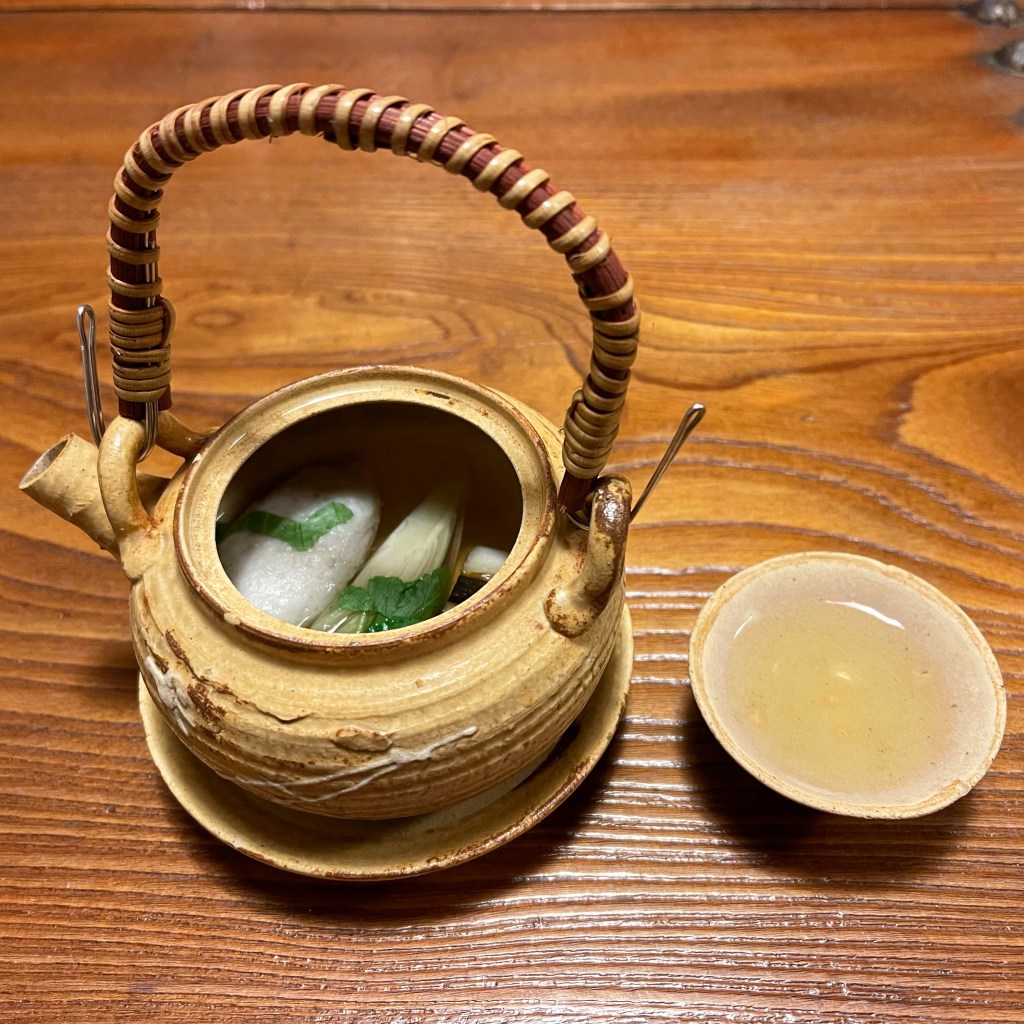 土瓶蒸しの中身はすっぽんと岩魚のしんじょ、茗荷や葱、三つ葉に銀杏でした。