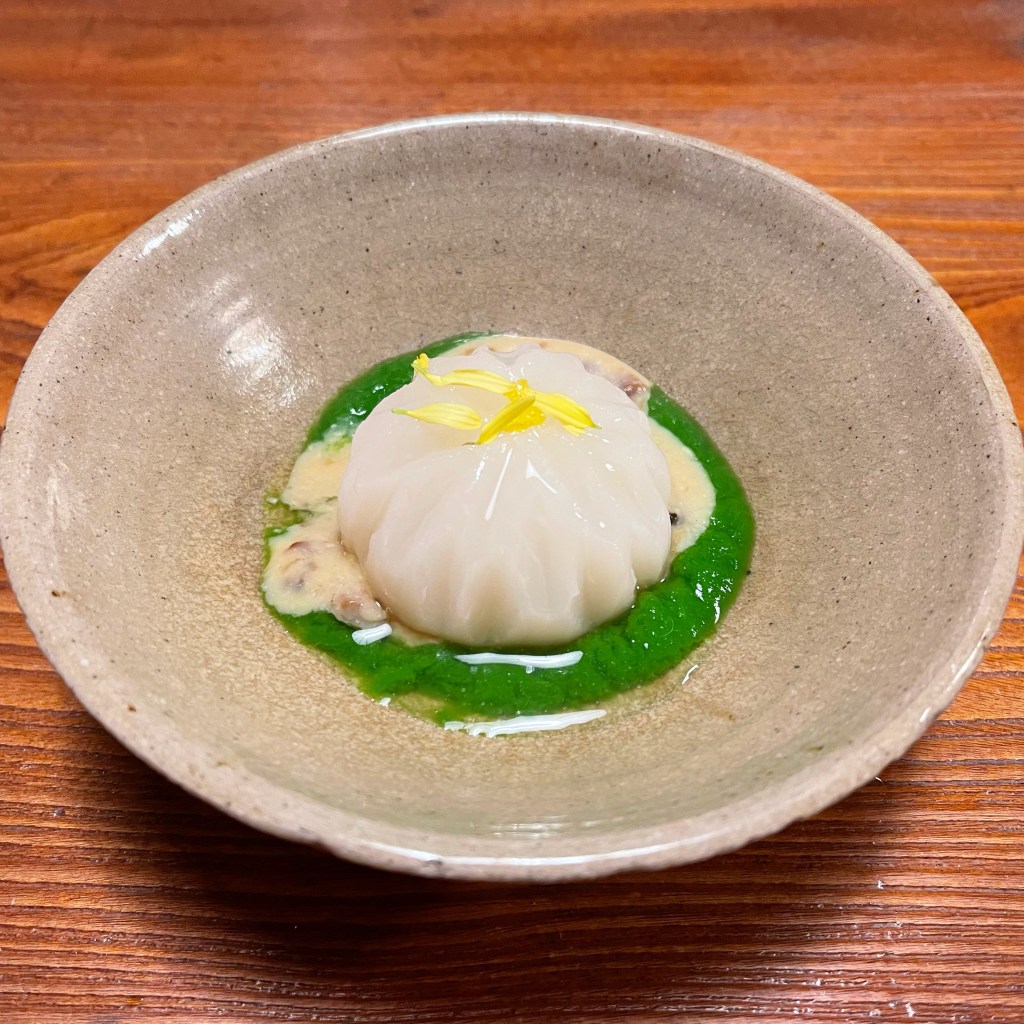 鮮やかな緑のソースは蕪の葉。ちゃなめつむたけとゆず味噌に、柚子と菊花を散らして。