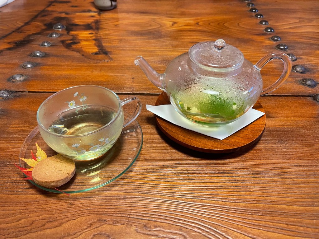 からかさだけのポタージュ、舞茸、銀杏、ゆで落花生、かぼちゃ、山胡桃、白玉、猪角煮、クロカワの煮浸し、りんごはアルプスおとめで蕎麦クリームとサワークリーム入り。
