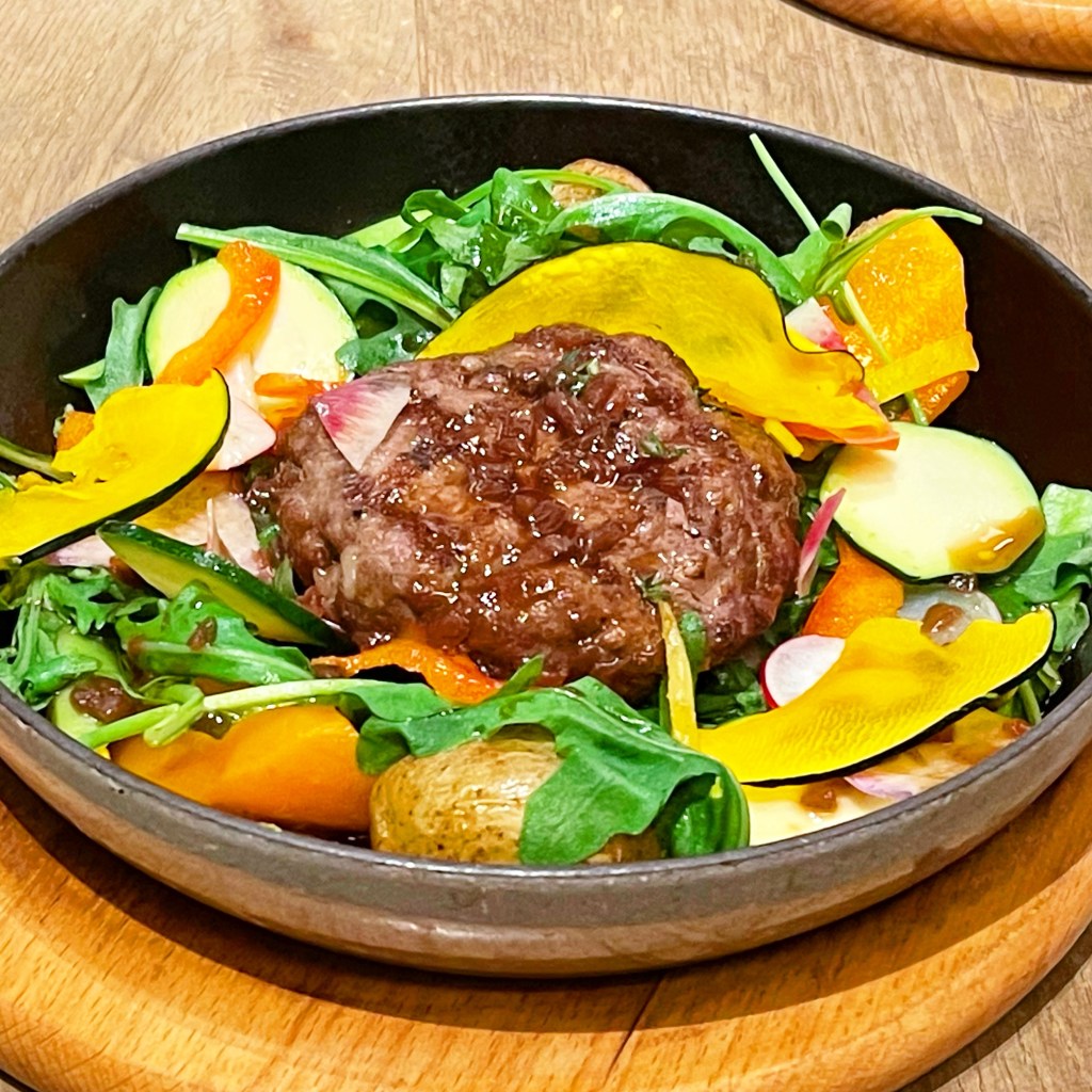 「ベジタブルハンバーグ ステーキソース」とメニュー通りに読んでしまうと、やや???になるかもですが、内容は「国産牛肉100%のハンバーグにたっぷりな蒸し野菜と醤油ベースのステーキソースが付いたセット」です。作り置きはせず、注文してから作り始めるのが売りとのこと。
