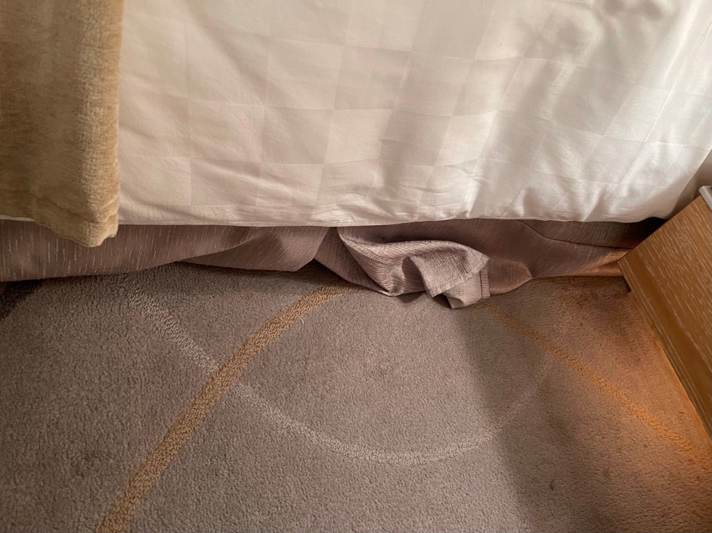 おざなり過ぎるベッドメイクにもびっくり。ホテルでは、ベット上にかけるカバーや枕をベットの顔と捉えており、特に綺麗に整えることが要求される箇所なのですが、巨大なシワがついたまま、下部のカバーも歪んでダルダルな上に歪んだまま足で突っ込んだかのようでした。