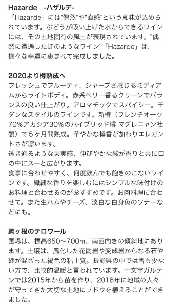 開けたのは長野の駒ヶ根にある十文字ガルテンさんの Hazarde(ハザルデ) 2020 。私の好きなベリー感強め系ワインで、2020からは樽熟成させているとのこと。