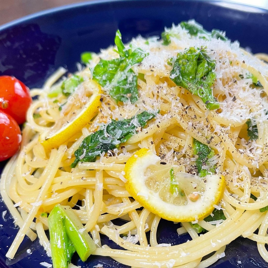 パスタは太めに、菜花のほろ苦さを少し足して。仕上げにレモンの皮を散らしました。