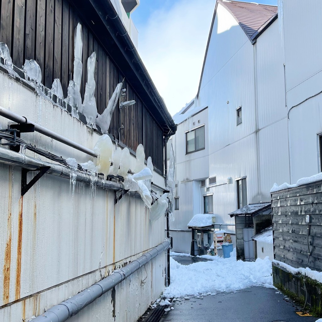 草津は大通りから外れた道でも殆ど除雪はされています。が、屋根から落ちた雪や周囲から落ちたツララなどが混ざり合い、雪溜まりになっている場所もちらほら見かけました。