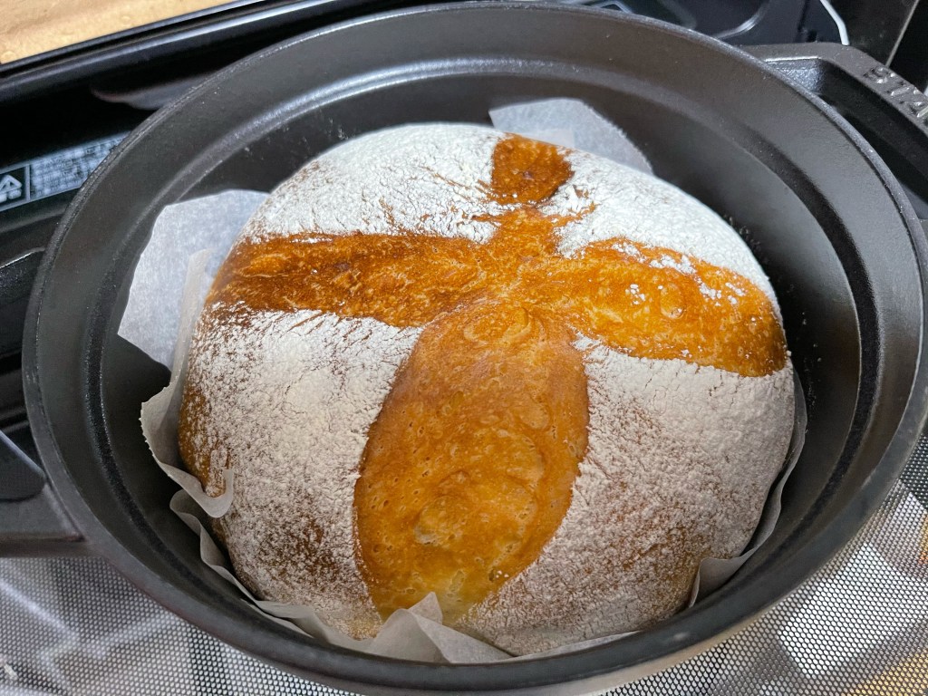 いつもなら失敗パンはピザ生地やピタパンにするところですが、そもそも成形すること自体が厳しいので、丸のまま、ストウブを使って焼くことにしました。