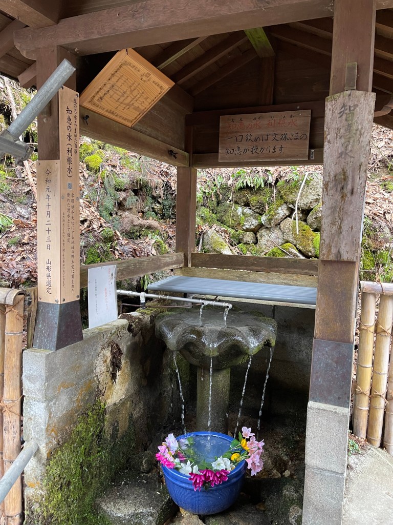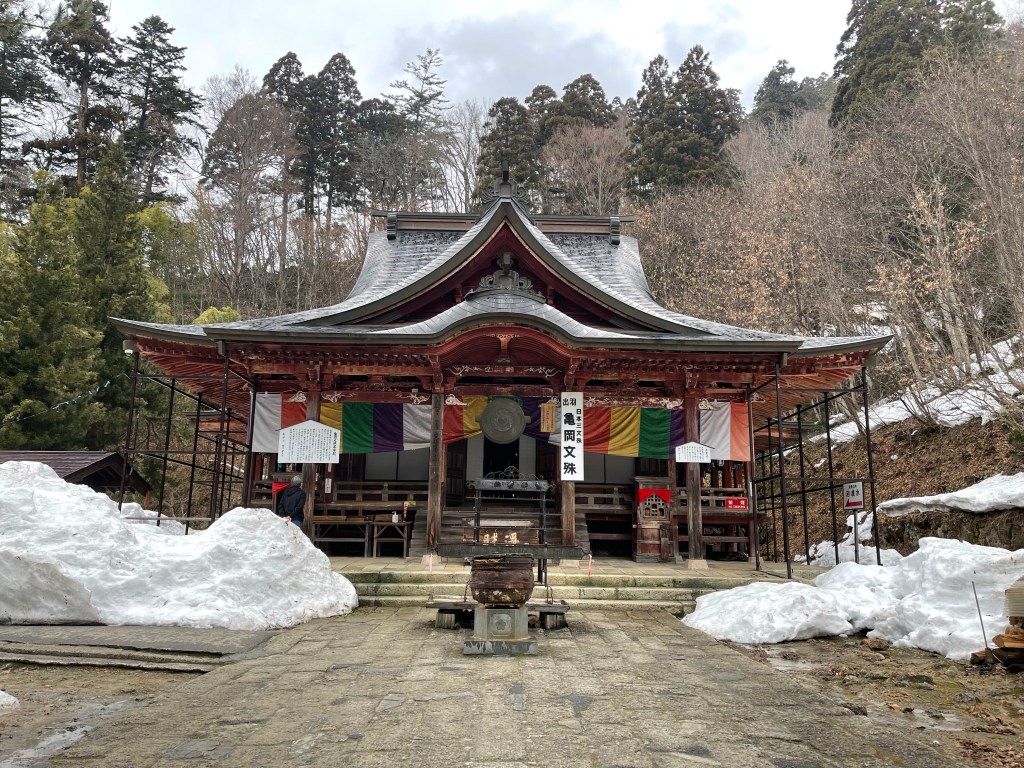 Travel 山形 亀岡文殊堂 (松高山 大聖寺) 投稿者: KYO 投稿日: 2022-03-312022-04-01 日本三文殊の一つである亀岡文殊堂に行きました。 駐車場からこの道を通り さらに上がって 手水舎へコロナで柄杓撤去中 亀岡文殊 の正式名称は、松高山 大聖寺で、真言宗智山派だそうです。 亀岡文殊堂 大黒天 生き大黒、走り大黒とも言われ霊験あらたかとか。頑張ったら両手でなんとか持ち上げられる重さでした。 大黒天の由縁 正面から裏に回ると利根水という湧水があり、一口飲むと文殊様の知恵が付く知恵水とのこと。 利根水 霊権あらたかな文殊様と知恵水ということで、少し前まで学生さんで賑わっていたのだろうと思われますが、卒業式も過ぎた頃なせいか、参拝者はほどほどでした。 共有: クリックして X で共有 (新しいウィンドウで開きます) X Facebook で共有するにはクリックしてください (新しいウィンドウで開きます) Facebook クリックして Tumblr で共有 (新しいウィンドウで開きます) Tumblr クリックして Pinterest で共有 (新しいウィンドウで開きます) Pinterest いいね 読み込み中… 関連 投稿者: KYO ペンギン好き、美味しい物好き。投稿の殆どは食レポのみ。 たまーに風景とか温泉とか読書とか。 フォロー&リフォロー、リンクはご自由に。 連絡頂けた場合には喜んで見に行きます。 KYO の投稿をすべて表示