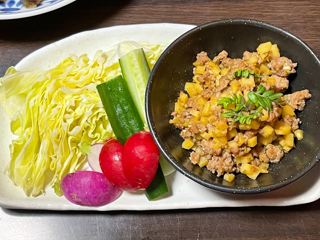 麺のおススメは細かく刻んでひき肉と合わせるパターンですね。今回は豚ひき肉を生野菜と合わせましたが、mic.mimicさんなら大豆ミートになるでしょうか。