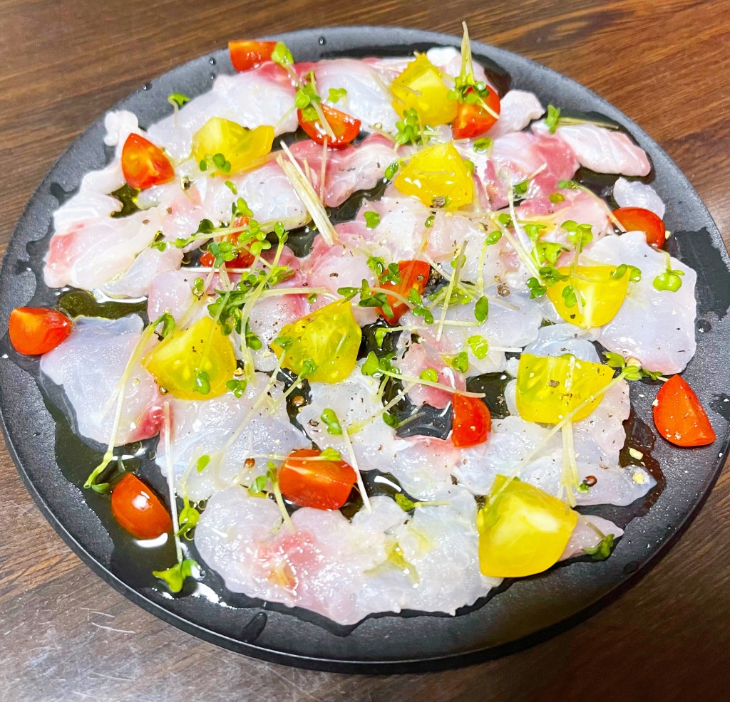 その夜の晩ごはんは、まず鯛のカルパッチョ。