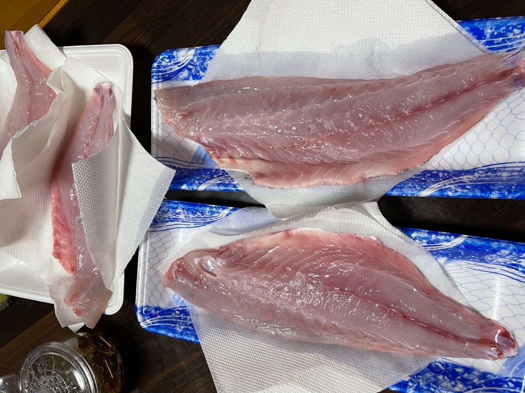 前回と同様、今回もスーパーの鮮魚コーナーにそのまま持ち込み、1尾はお刺身に、残り3尾は3枚におろして貰いました。