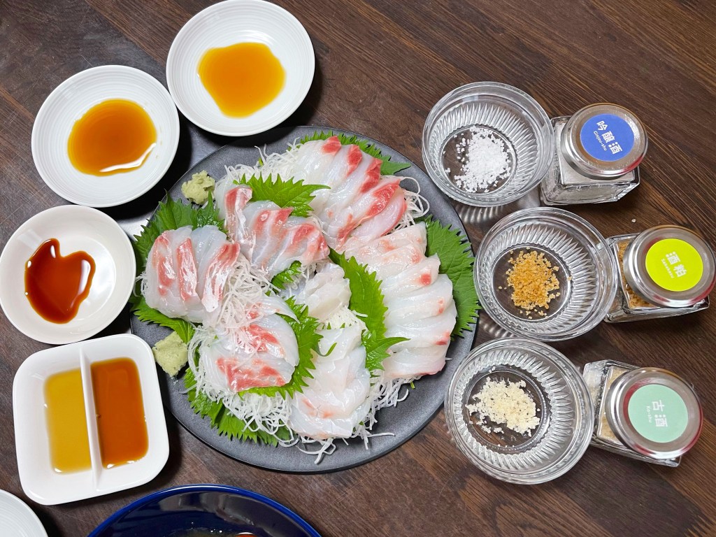 塩は3種、この前の山形旅行で買って来たものです。海塩にほんのり香るお酒の風味が付いていて、刺身を味変するにはとても良かったです。