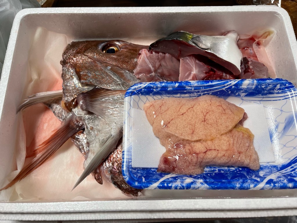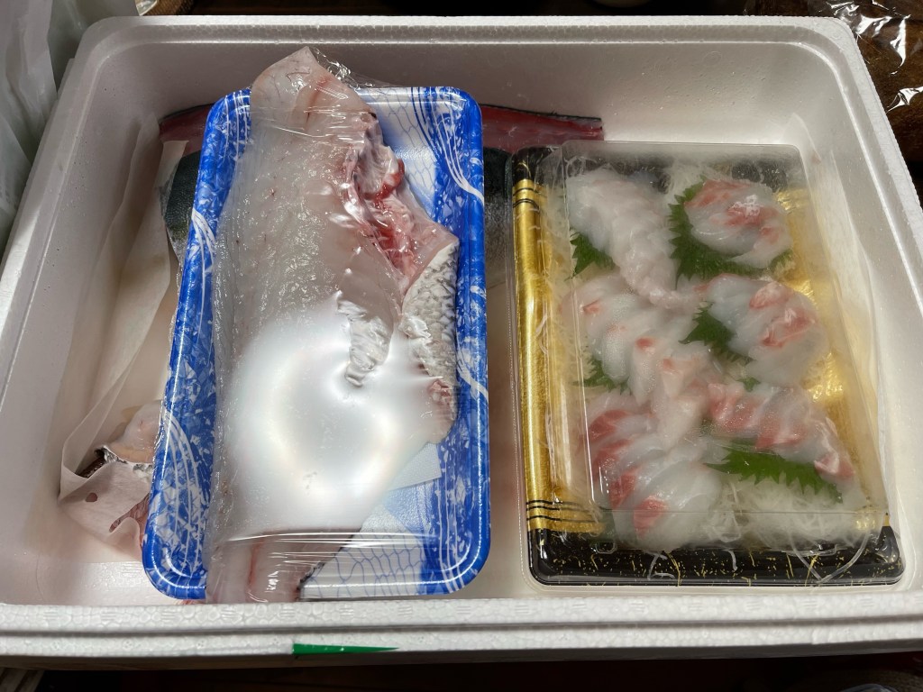 今回の鯛は普通サイズ?だったのか、刺し盛りは1パック内に収まっていました。おそらく前回の半分程度のサイズかと思います。