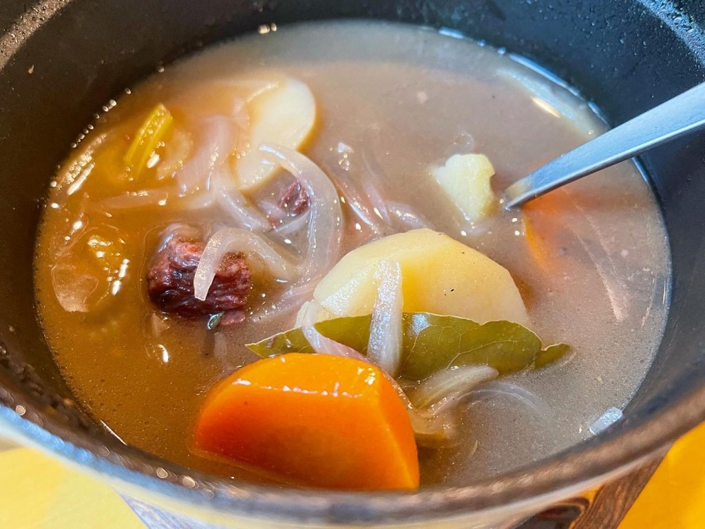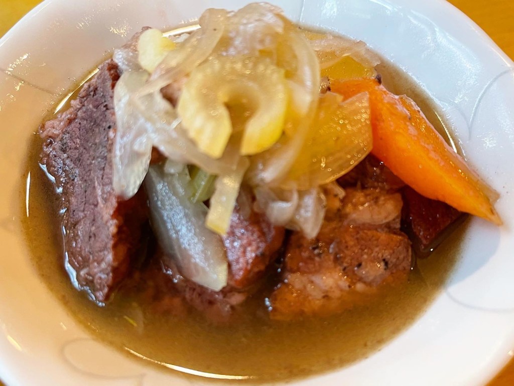 ベッコフは牛豚羊のお肉を使ったアルザス地方の煮込み料理だそうです。別名ベックオフ(パン屋の竈)とも。店主さん曰く「竈のあるパン屋さんでないと出来ないスープ」とのことでした。