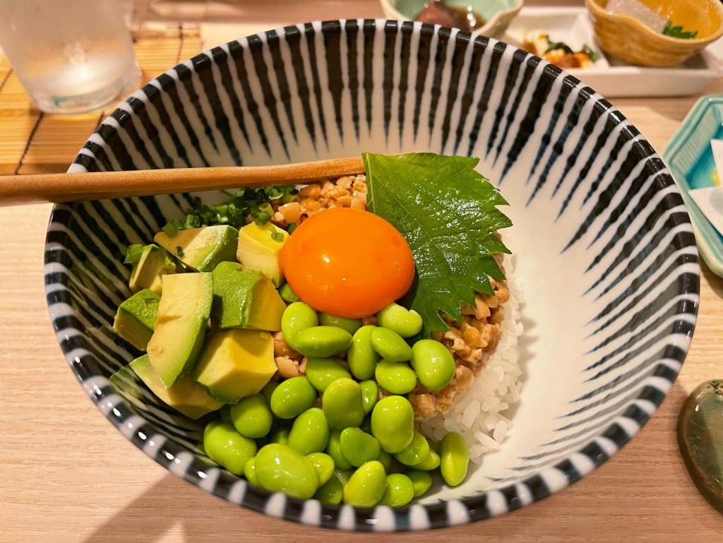ご飯+ ひきわり納豆 + アボカド、枝豆