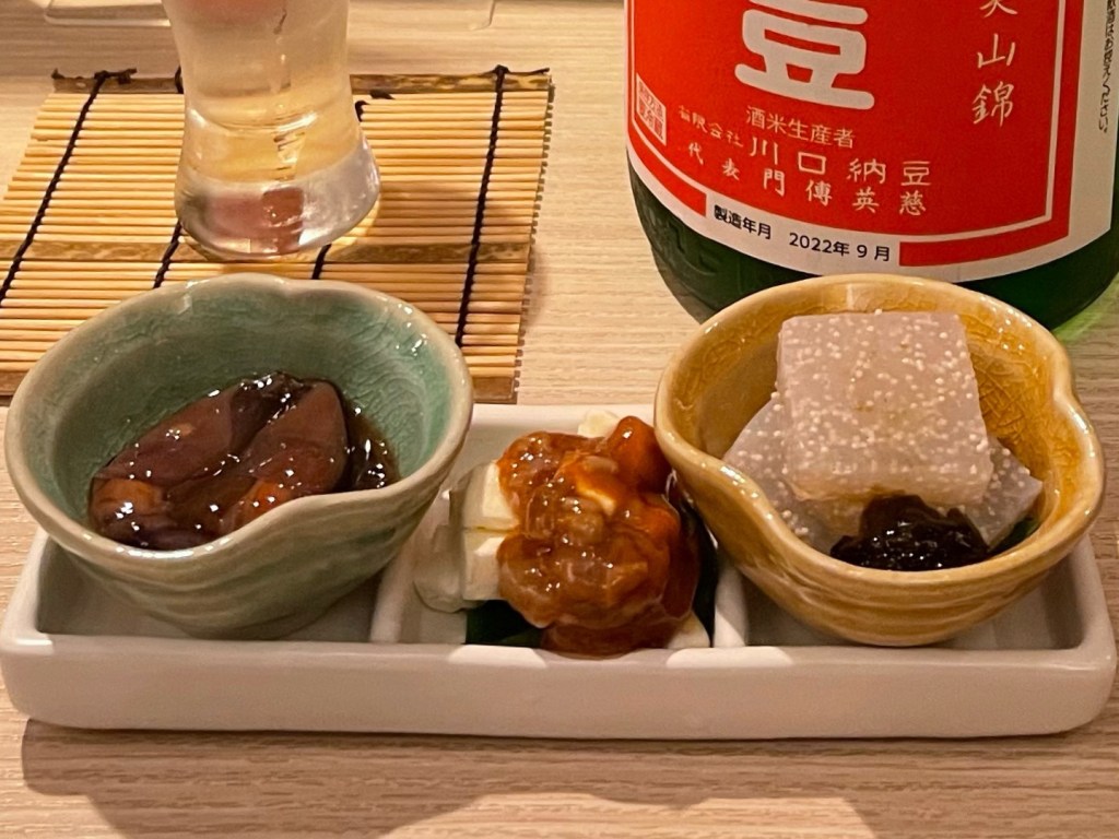 最初の一杯を飲みつつ、日本酒に合うアテ盛り3種を。