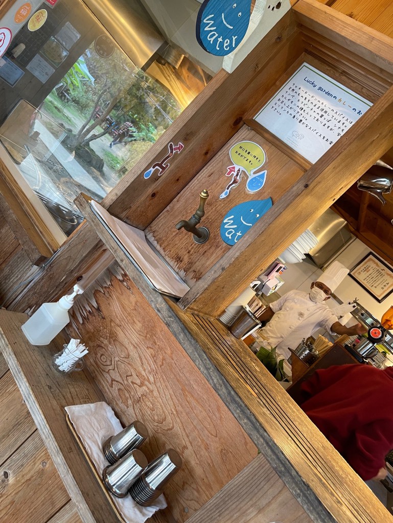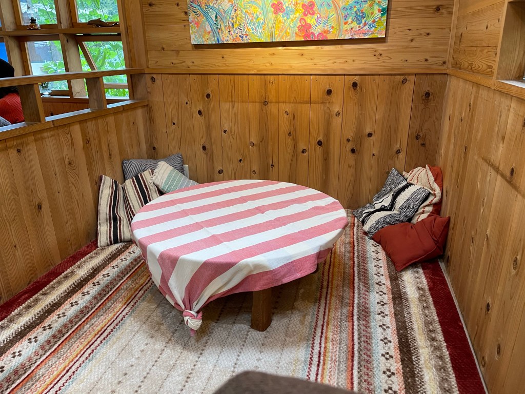 母屋には2〜4人用のテーブル席がいくつかあり、中央には暖炉もありました。とても居心地の良さそうな座卓席もありました。私達が入った時はちょうど小さなお子さん(8ヶ月)のいる家族がカレープレートを食べている所で、彼らが帰った後、テーブルカバーから下の絨毯まで一式丸っと変えており、コロナ対策もバッチリそうでした。