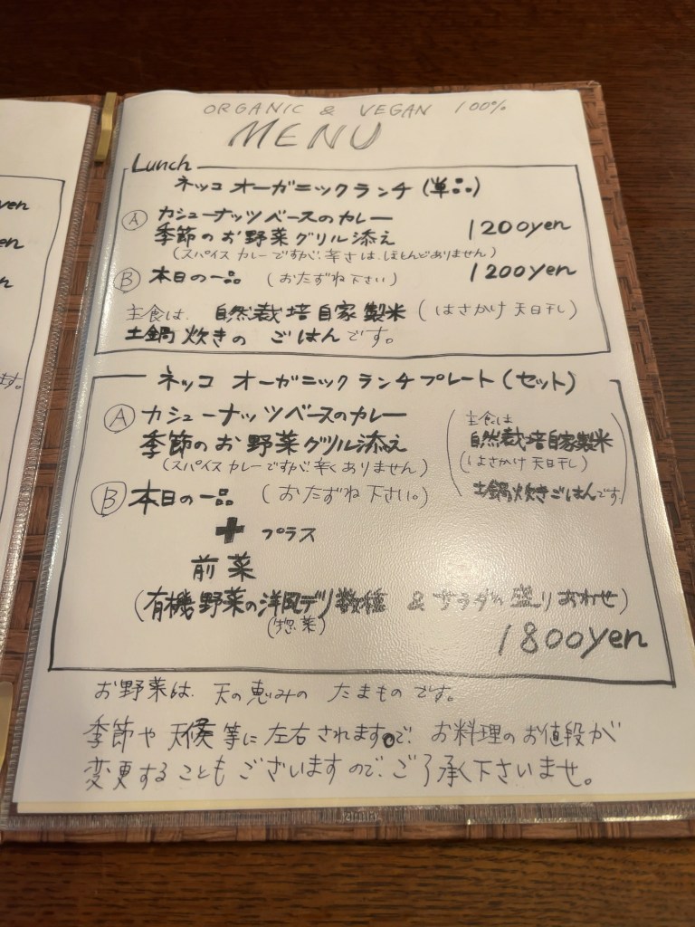 メニューに「ORGANIC&VEGAN 100%」とあったので、魚や肉や卵なども使っていないと思われます。