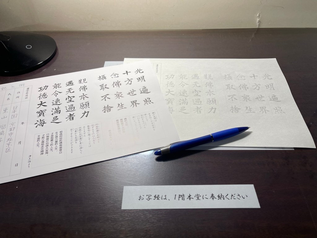 入館時に頂いた袋の中にボールペンと写経用の用紙が入っていて、2階の奥の部屋で写経することが出来ました。写経は任意ですが、せっかくのご縁なので写経させて頂き、しっかり納めさせて頂きました。
