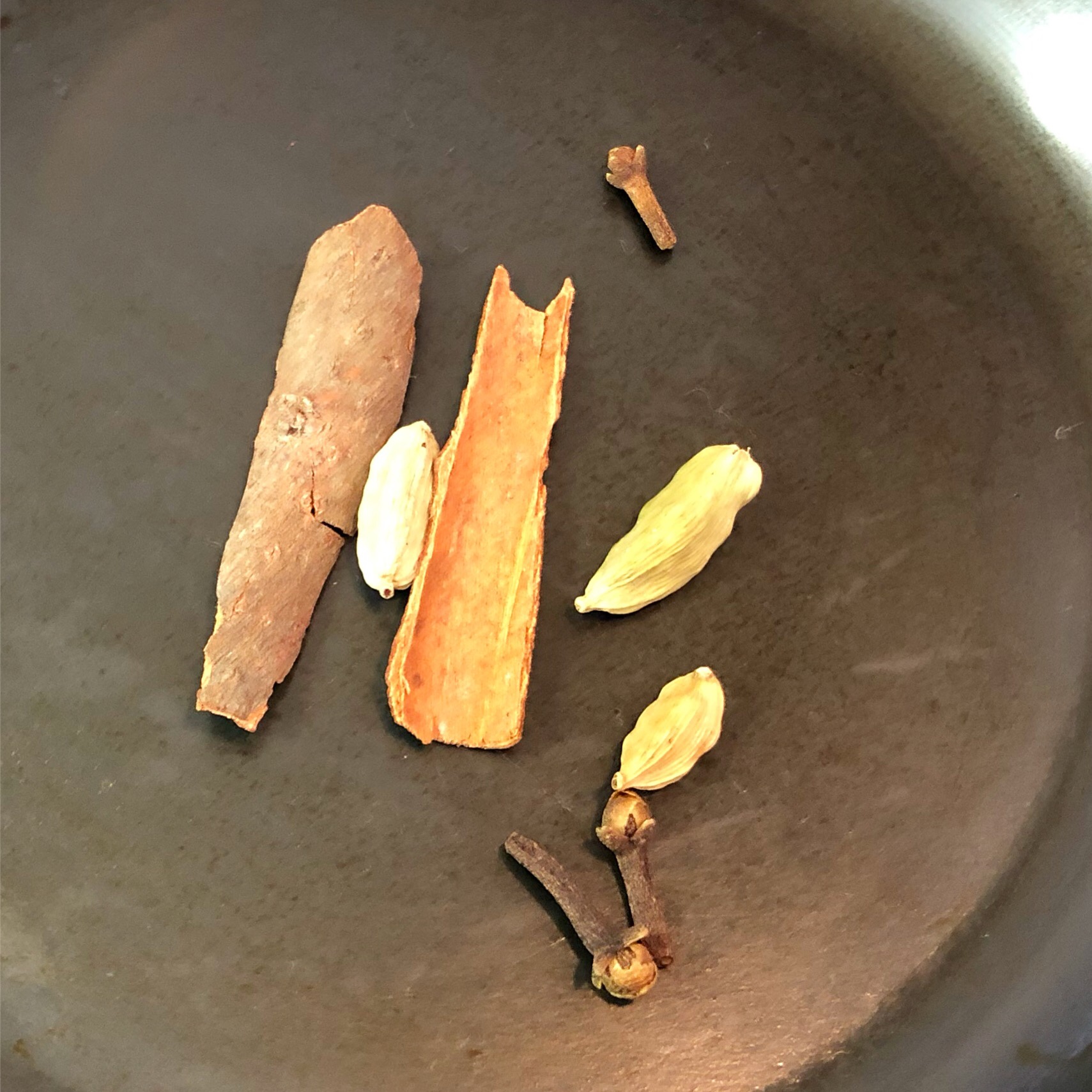 まずは、いつものチャイ用スパイスを用意します。カルダモンをすりおろすのは初めてのことだったので、今回は大きなブラックカルダモンも入れてみました。
