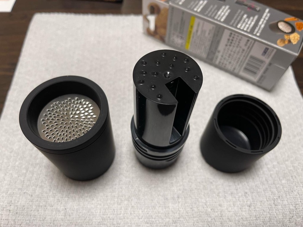こちらのスパイスミルは如何にもマイクロプレインらしいおろし金的なステンレス刃が付いていて、中に入れたスパイスをもう一つのケースで押し付けながらすりおろすという、とてもシンプルな構造です。
