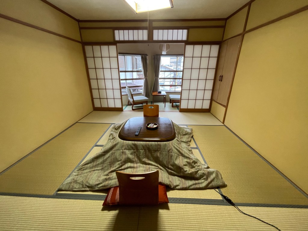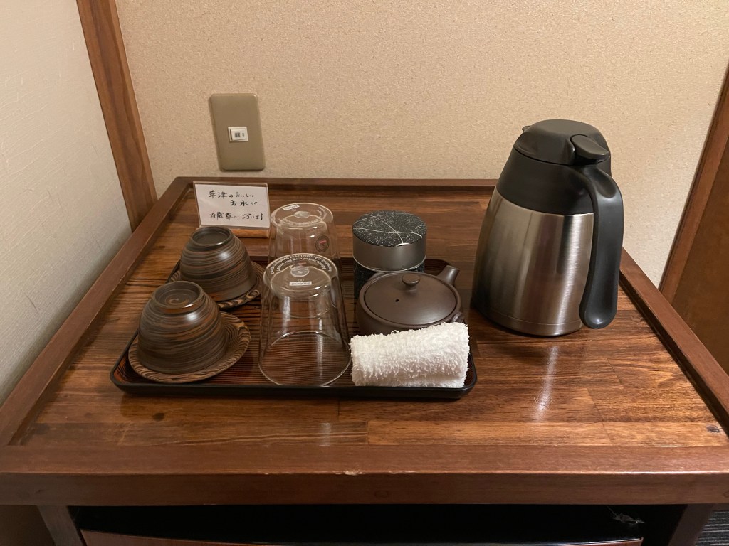 純和室という説明で、よくある和室と広縁の構成でした。素泊まり宿とはいえ、設えは通常の温泉旅館と変わらない印象で、基本的な備品類は一通り揃っていました。