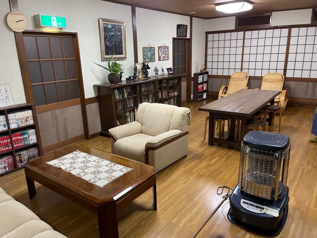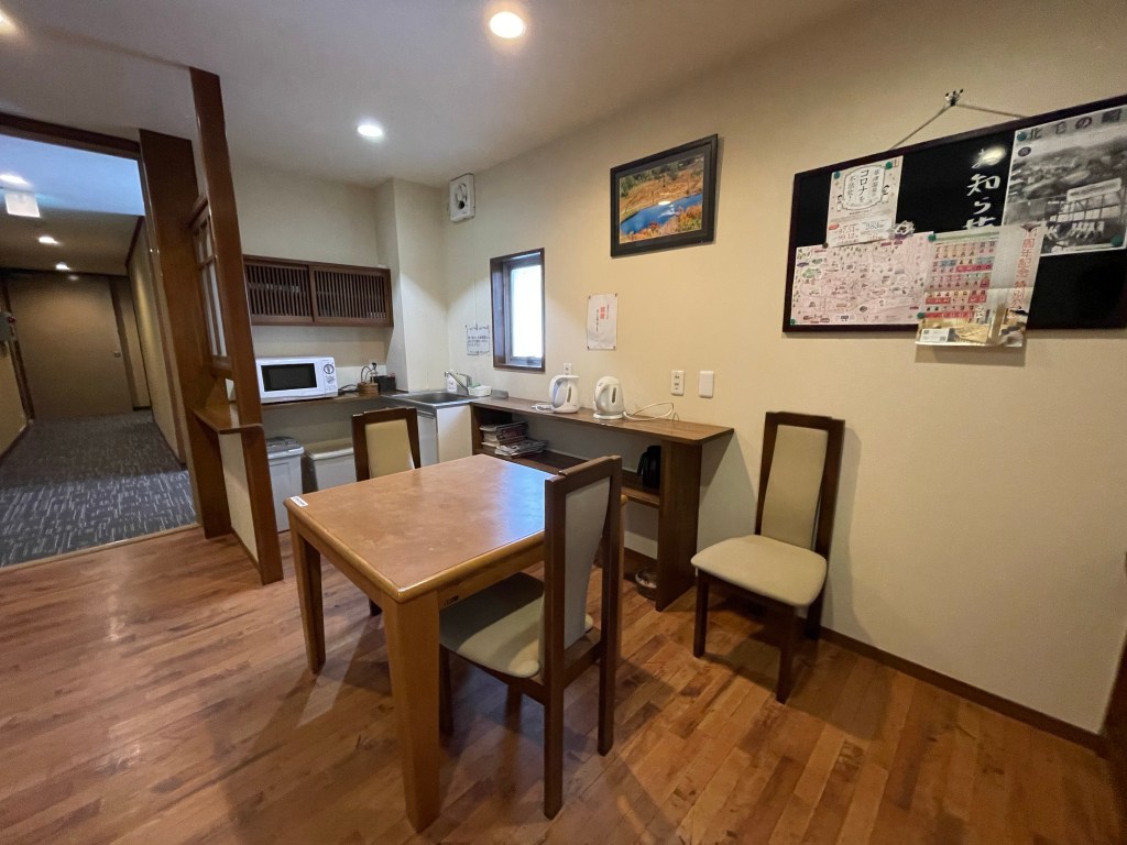 お宿の本館には自由に使える共有スペースがありました。電子レンジや湯沸かしポット、食器類に洗い場など、簡易設備も整っていました。