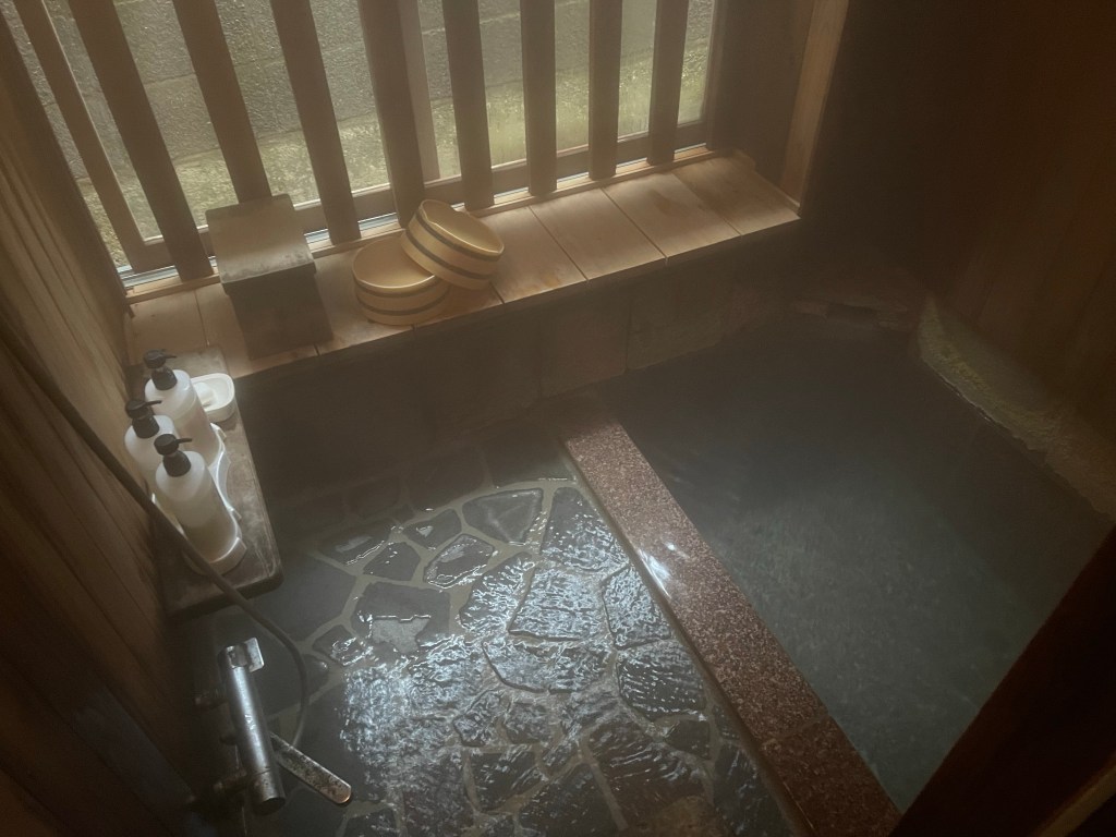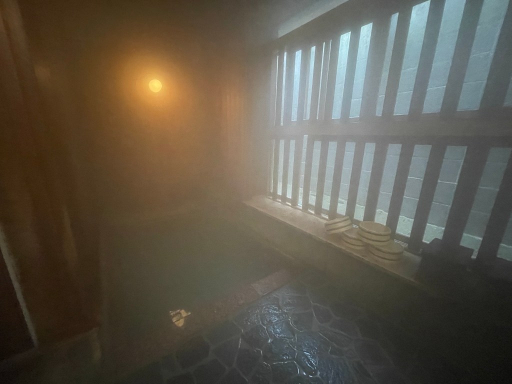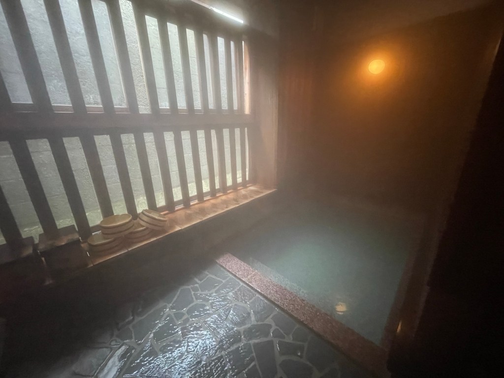 貸切風呂が3つあり、各々サイズが異なりました。もちろん全てが源泉掛け流しです。おおよそ30分程度で湯が入れ替わるほどの湯量だそうです。よく見ると、湯船からお湯がざーざー溢れているのがお分かり頂けるかと思います。