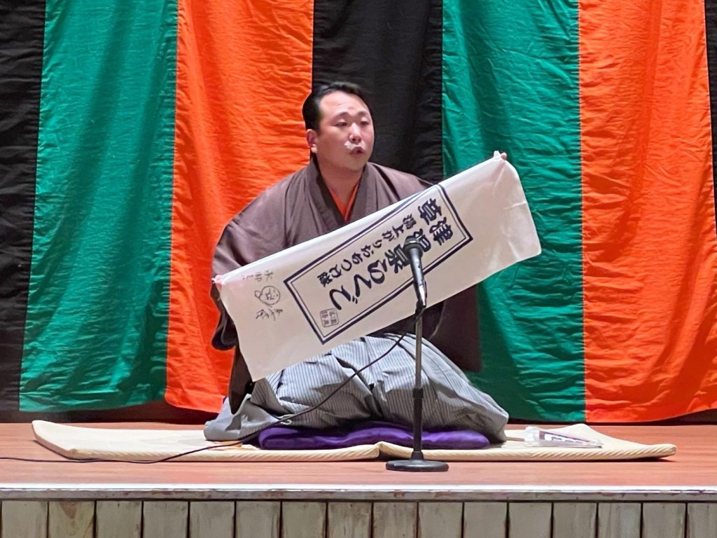 草津温泉らくごは、原則として365日休みなく開かれているそうです。演者は二ツ目の落語家さんを中心としたメンツで、私達が行った時は古今亭今いちさんでした。