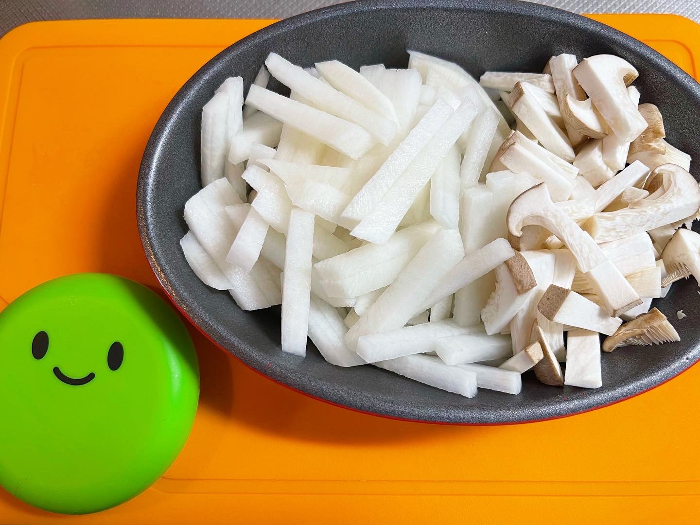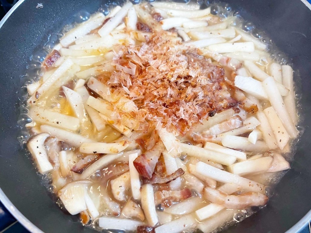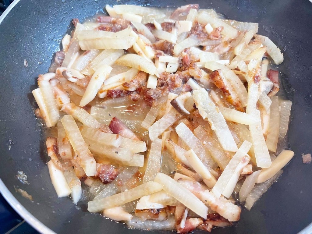 ベーコンから脂が出てきたら大根とエリンギを入れ、脂が回るまで炒めます。その後、ヒタヒタ程度の水(今回は具が多いので少なめの100cc)を入れ、鰹節を適当に入れて馴染ませ、蓋をして7〜8分、弱火から弱中火程度で汁気が飛ぶまで蒸らし焼きをして味を染み込ませます。この際、以前は塩を入れていましたが、ここに少しだけ新玉ねぎ麹を入れました。