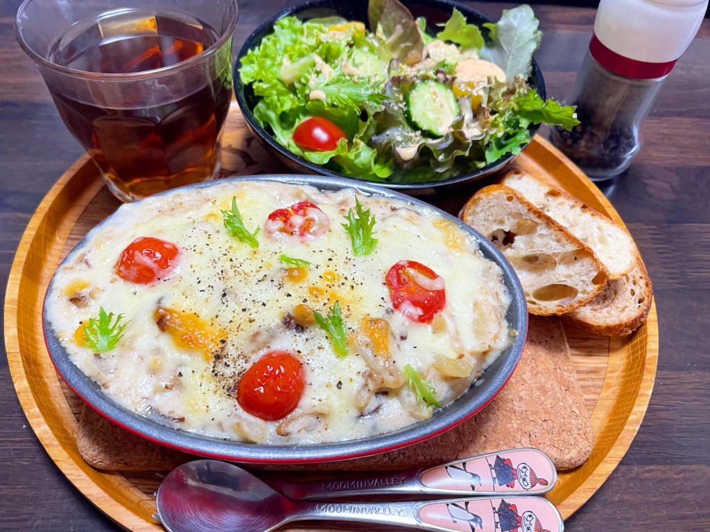 焼き目をみてグラタン皿を取り出し、サラダから少し拝借した色味の青葉と胡椒を散らせば、お一人様ランチの完成です。