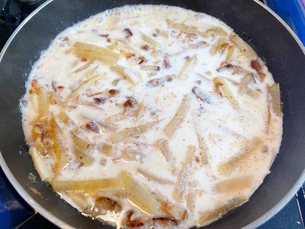 粉牛乳に火を通すと小麦粉作用でとろみがつきます。途中で一度味見をして塩気がまだ少し足りないようだったので、玉ねぎ麹をもう少し足しました。