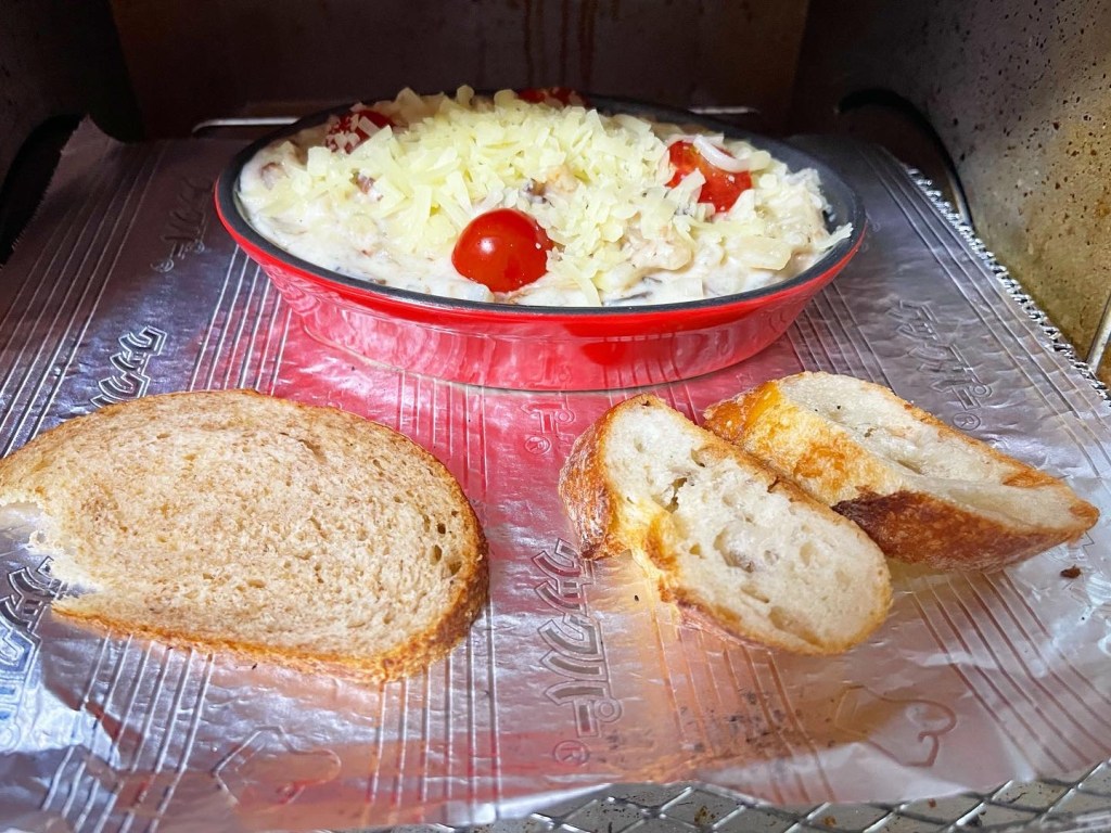 準備しておいたバゲットと共にオーブントースターへ入れ、チーズに焼き目が付くまで焼きます。