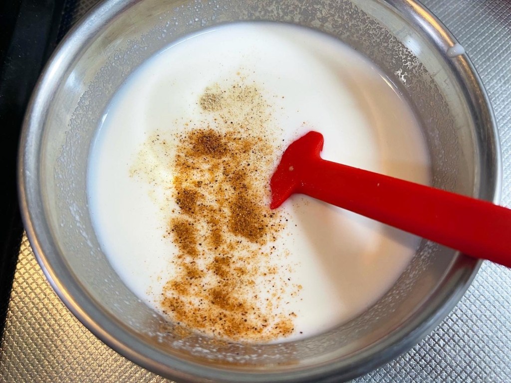 蒸らし焼きをしている間に粉牛乳の準備をします。今回は具が多いので、牛乳は100cc、小麦粉は小さじ2ちょい。白胡椒とナツメグも少々入れました。