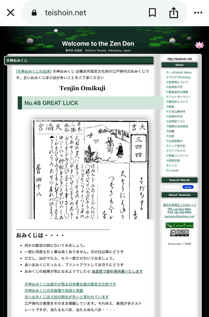 神奈川新聞に掲載されていた記事で見つけたのですが、横浜にある曹洞宗貞昌院のサイトで江戸時代のおみくじがひけるそうです。