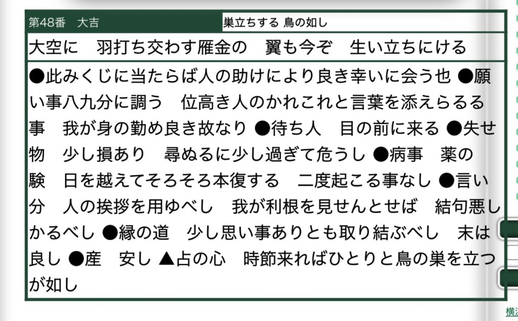 私のスマホからだとおみくじの全体像はスクロールしないと見られませんでしたが、下に現代語訳もあって、とても親切な作りになっていました。