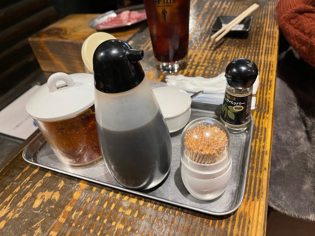 タレはシンプルであっさり目の醤油ベースでした。以下の調味料をお好みで足しながら食べました。