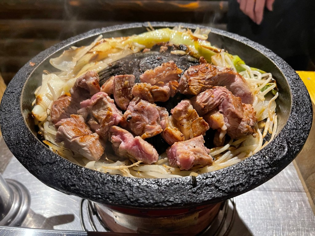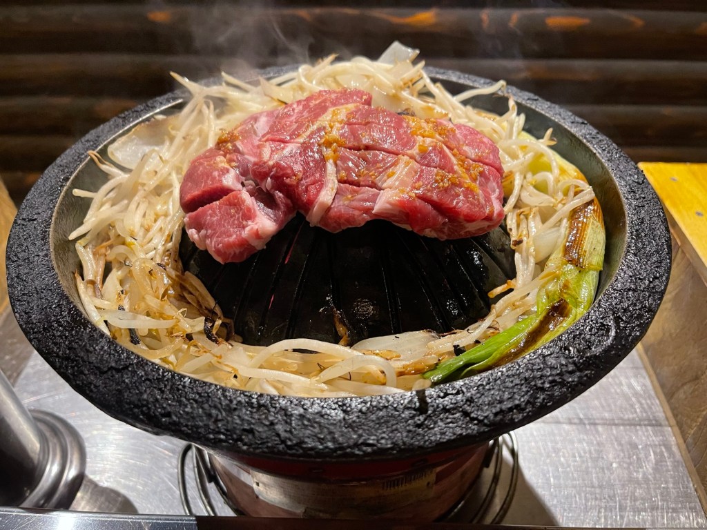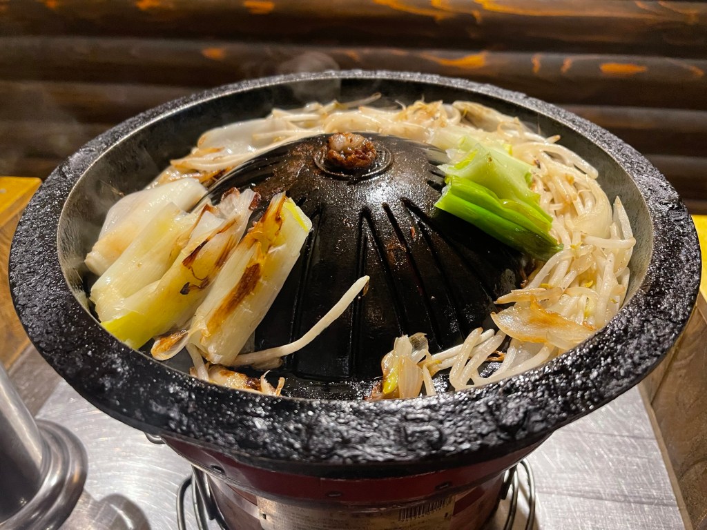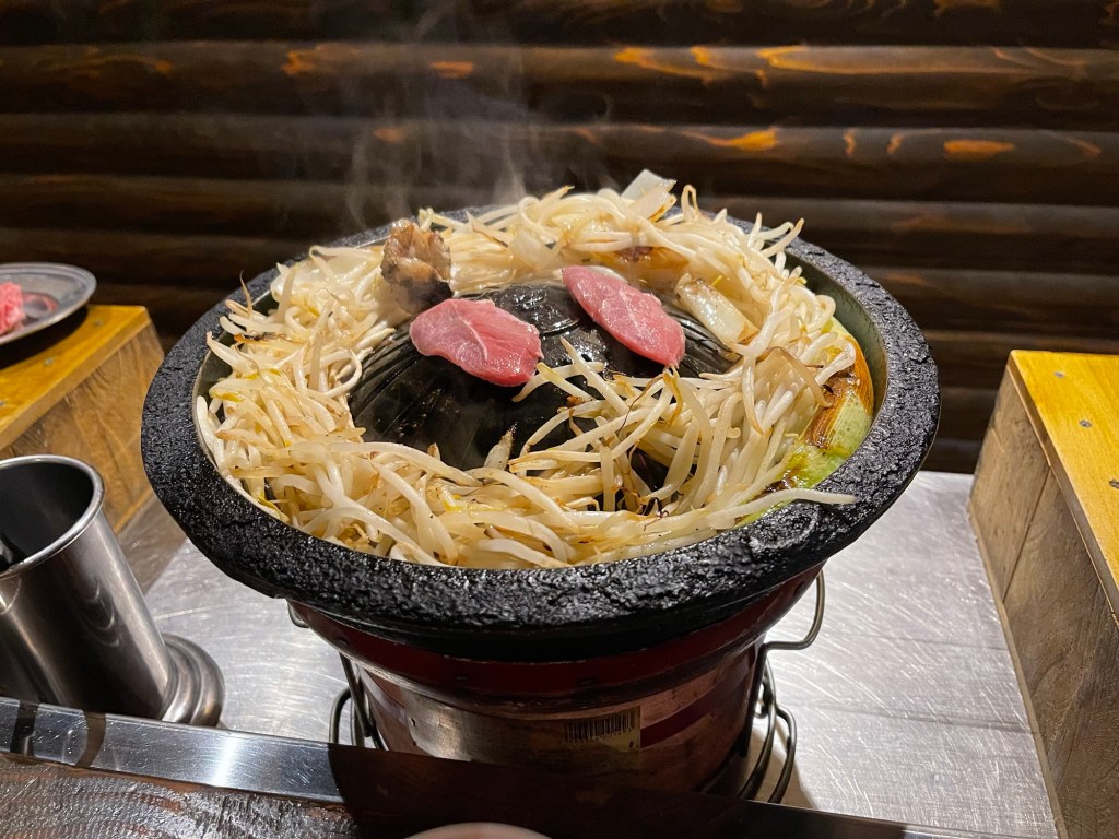 注文して待つことしばし。まずは七輪とジンギスカン鍋がセットで登場しまして、既にジュージューと煙も上がってました。