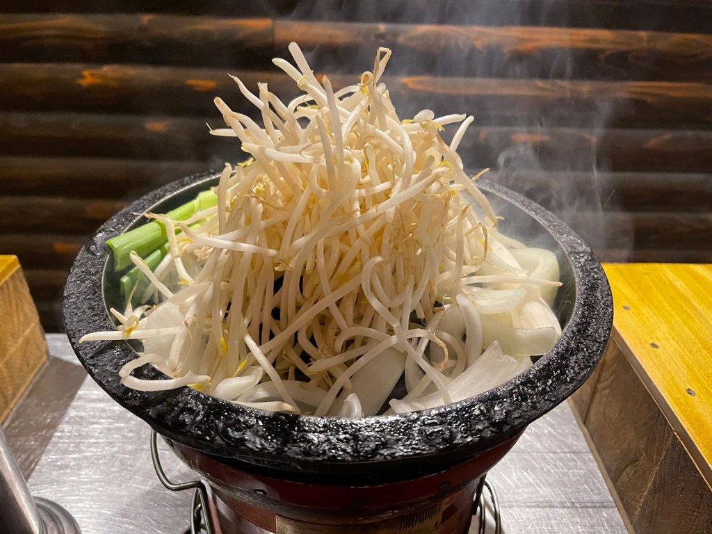 鍋が置かれてからしばらくして、頃合いを見計らった所で店員さんがささっとやって来て、焼けた野菜を器用にトングでひっくり返し、脇へと移動させました。追加のネギは蒸し焼きするのが良いそうで、もやしの下に収まりました。