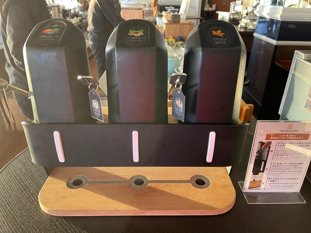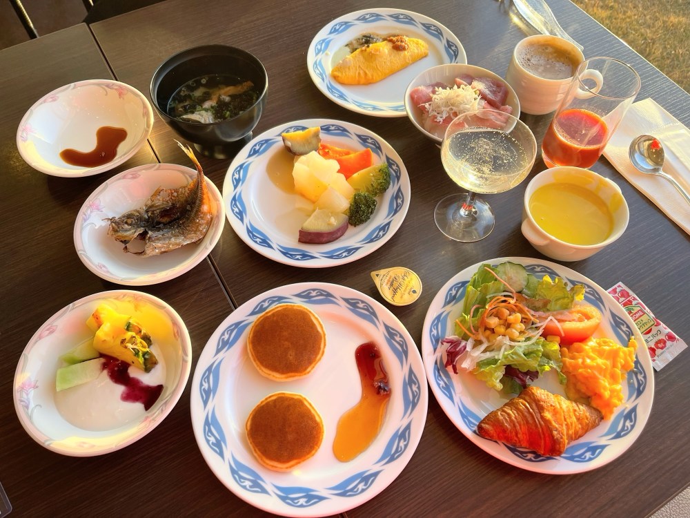 サラダやパンなどの定番ビュッフェは確認の意味を込めて少しだけ。オムレツはシェフに注文してから作って貰える方式で、パンケーキは自動製造機が作ってくれました。