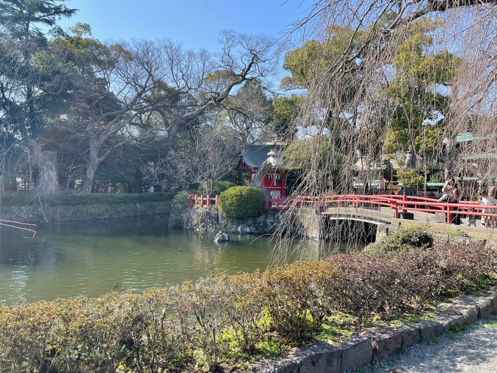 神池と厳島神社を横目に見ながら先へ進みます。しだれ桜が池の周囲を囲っていました。
