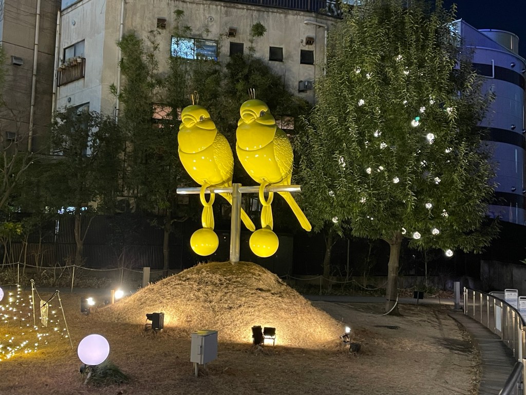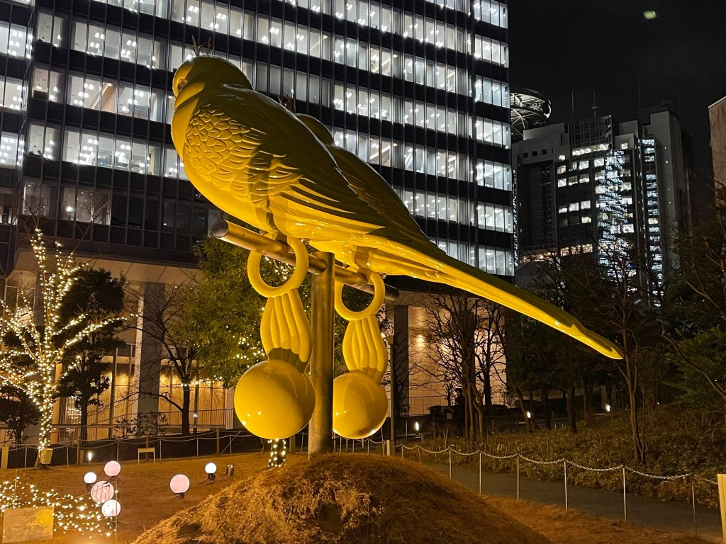 を出た後、赤坂界隈を久しぶりにぶらぶらしました。赤坂サカスからbizタワーに抜ける途中、巨大な黄色い鳥さんが見えて来たのでパチリ。