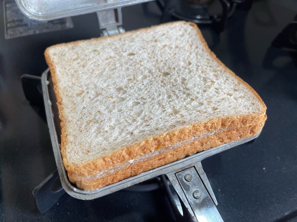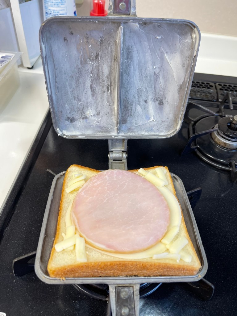 具をのせたらもう一枚食パンをのせ、蓋を閉めて火にかけます。