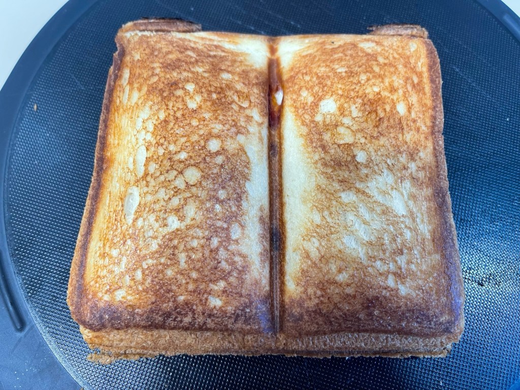 バターの推奨量は10gですが、全面に薄く塗って最後まで焦げないで焼ける目安は4gです。特に試行錯誤した訳ではなく、薄く塗り広げた量を測ったら4gだったというだけですが、焼ける際のパンのくっつきを抑える分にはこれで足ります。