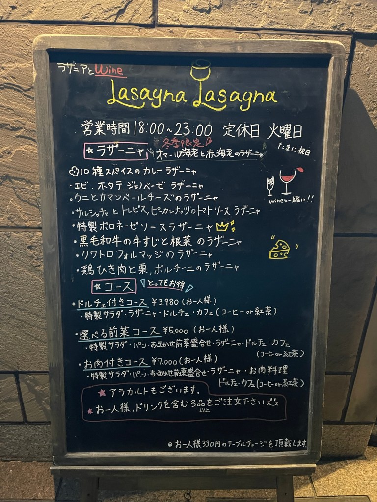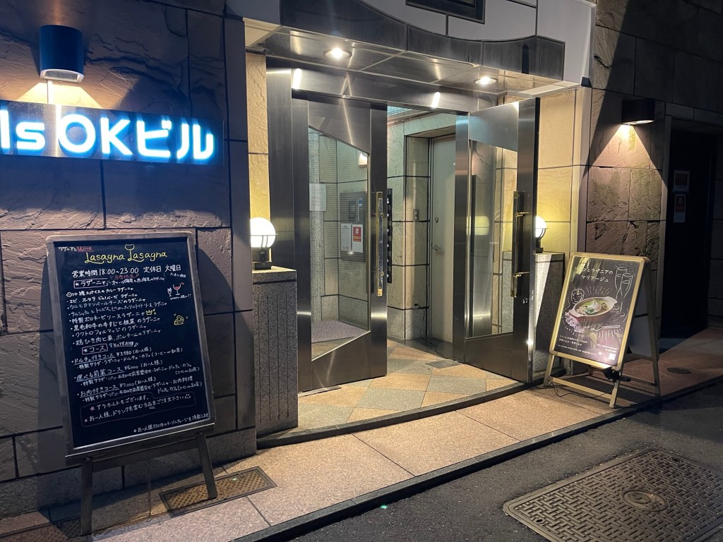 こちらは、ラザニアとワインのお店、ラザーニャラザーニャさんです。ビルの6階なので、よく見ないと看板を見落とすのではと思います。