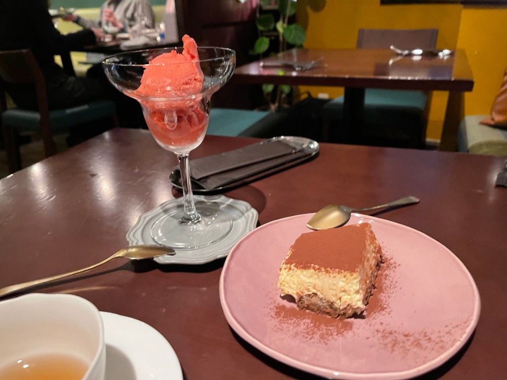 デザートのドルチェはティラミスといちごシャーベットをチョイス。ドリンクはコーヒーと紅茶です。