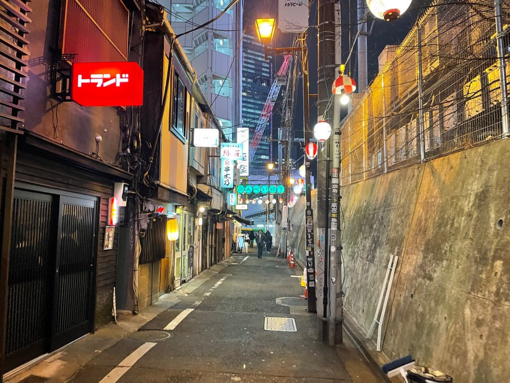 渋谷のスクランブル交差点のすぐ近くで、公園通りから一本裏に入った所にあります。右側が線路です。